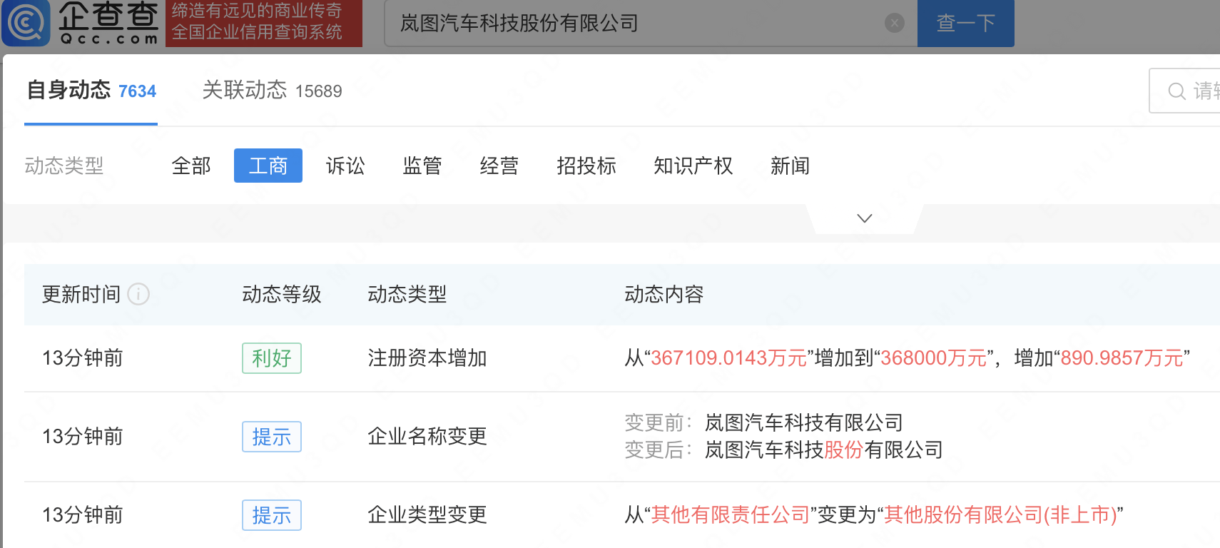 图/岚图汽车注册资本增加至36.8亿元来源/企查查
