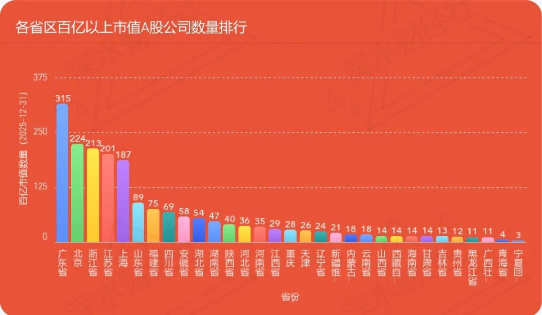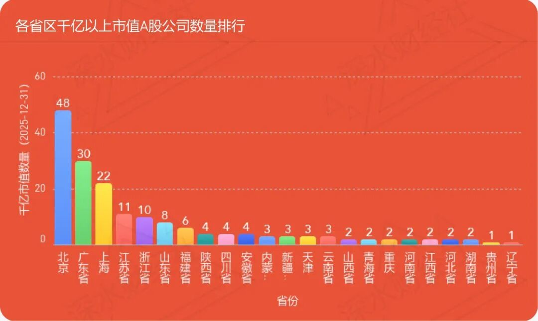据WIND数据显示,截至2025年底,A股共有175家公司收盘市值超千亿,但光是北京、广东、上海三地就占了100家,这三地,确实是顶级玩家。
