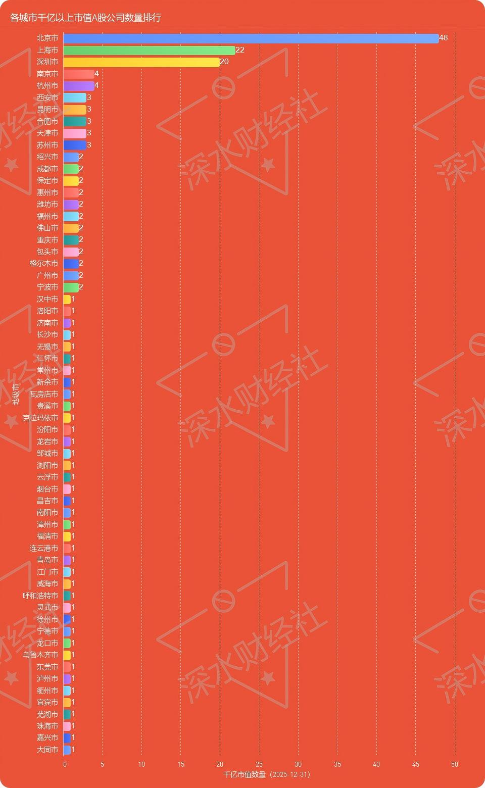 具体到城市来看,北京以48家千亿市值公司遥遥领先,是第二名上海(22家)、第三名深圳(20家)的两倍多。