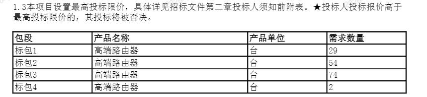 该项目共采购159台路由器整机,划分为4个标包,除了标包1选取2家中标人外,其余标包均有1家中标人。从各个标包的产品需求数量来看,标包4数量最少,仅为两台,投标人都奔着前三个标包去了。