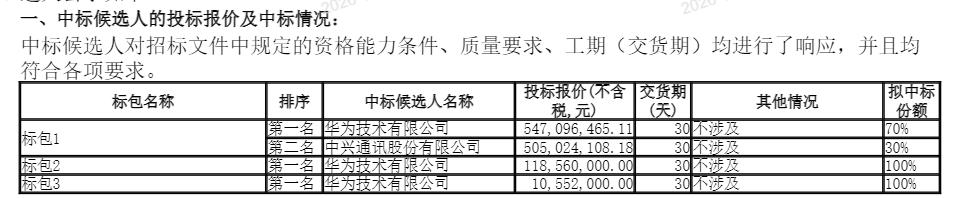 标包1中,华为以约5.47亿元的不含税报价中标70%份额,中兴通讯以约5.05亿元的不含税报价中标30%份额,两者投标报价差额超过4200万元。