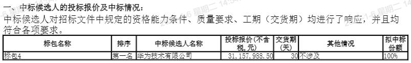 标包2、标包3、标包4均由华为中标,不含税报价分别约为1.1856亿元、0.1055亿元、0.31亿元,标包4采用的是直接采购的方式。