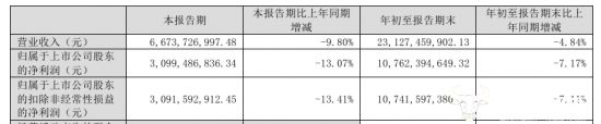 财报数据显示,今年前三季度,泸州老窖营业收入为231.27亿元,同比下降4.84%,归母净利润为107.62亿元,同比下降7.17%。其中第三季度单季度公司收入为66.74亿元,同比下降9.80%,归母净利润同比下降13.07%至30.99亿元,营收和利润均有所下降。