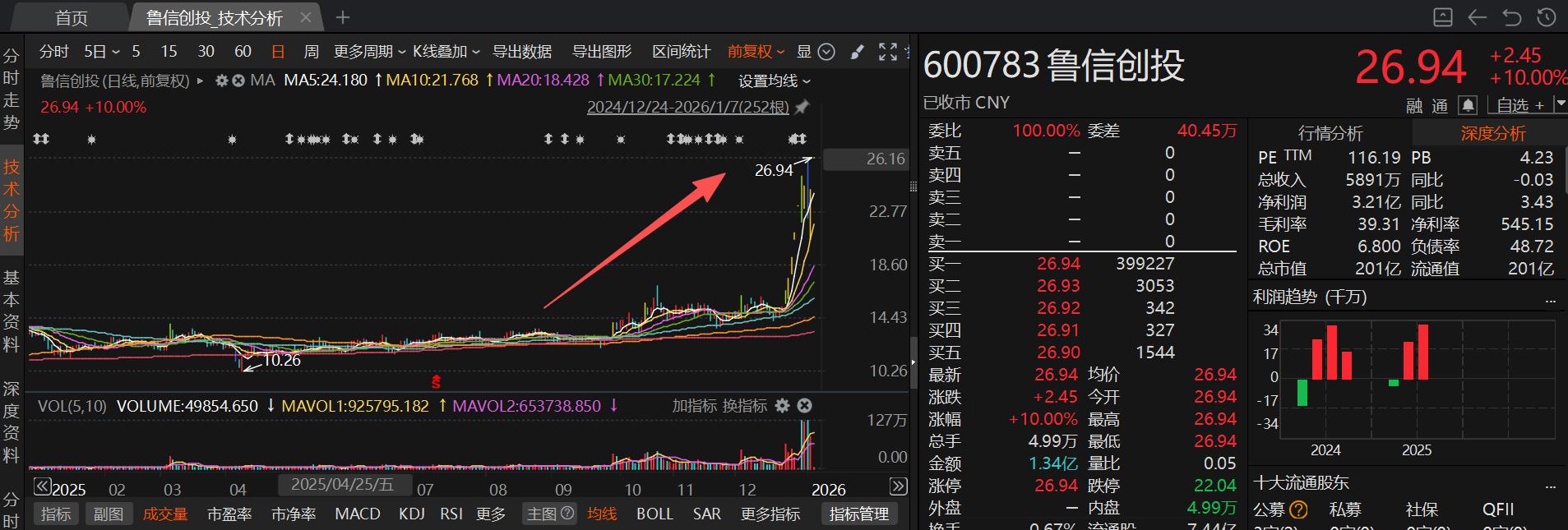 而鲁信创投也作为蓝箭航天的参股企业之一,股价表现同样亮眼,今日收盘录得9天7板。公开资料显示,鲁信创投是国内首家上市创投机构,公司形成了以创业投资为核心的权益类投资、私募基金投资及管理和产业投资及运营三大主业,坚持投早投小投长期投硬科技,助力国家科技创新。鲁信创投2025年12月26日发布股票交易风险提示公告称,公司注意到近期市场对商业航天领域以及公司参股基金在该领域的投资情况关注度较高。截至目前,公司参股的三只股权投资基金合计仅持有蓝箭航天空间科技股份有限公司0.89%股权,股权穿透后对公司财务状况和经营成果影响较小。此外,有报道称,鲁信创投通过投资10多家细分领域龙头企业,布局产业链上下游,积极打造商业航天产业“生态圈”。
