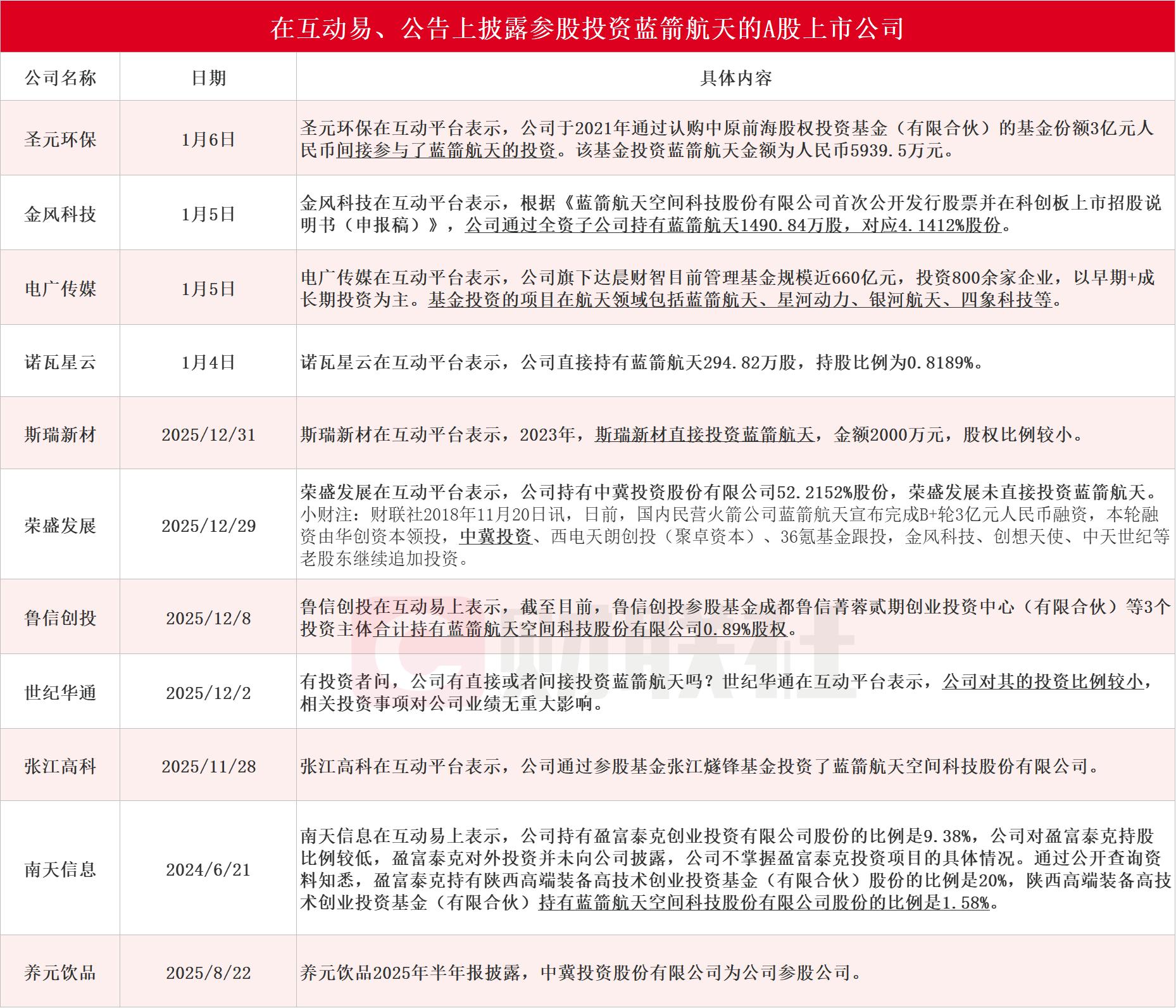 此外,据财联社不完全统计,圣元环保、电广传媒、诺瓦星云、斯瑞新材、世纪华通、张江高科、南天信息和养元饮品也在互动易等平台披露参股投资蓝箭航天。另外,据财联社不完全统计,A股公司中,越秀资本、市北高新、海翔药业、炬华科技、淳中科技、泰胜风能、南钢股份、万隆光电、兆驰股份等也分别有直接/间接投资参股星际荣耀、中科宇航、星河动力和天兵科技。在互动易、公告上披露参股投资蓝箭航天的A股上市公司,具体情况如下: