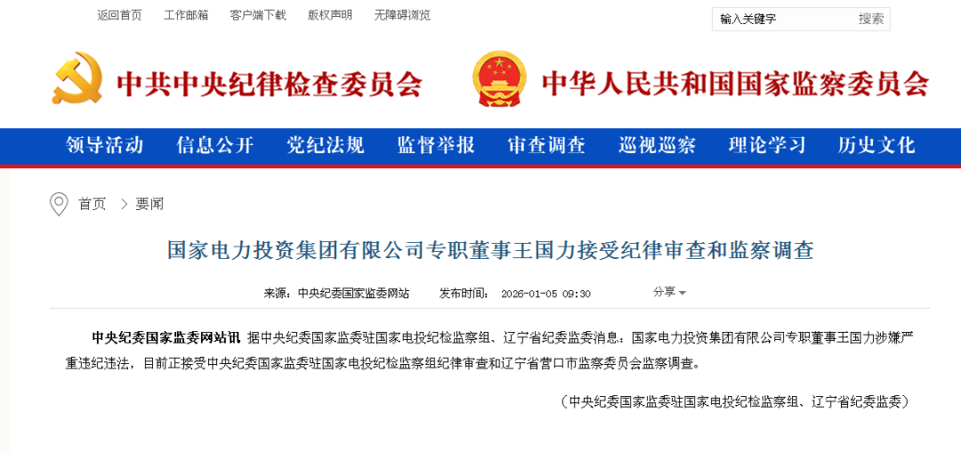 中央纪委国家监委网1月5日消息称,国家电力投资集团有限公司专职董事王国力涉嫌严重违纪违法,目前正接受中央纪委国家监委驻国家电投纪检监察组纪律审查和辽宁省营口市监察委员会监察调查。