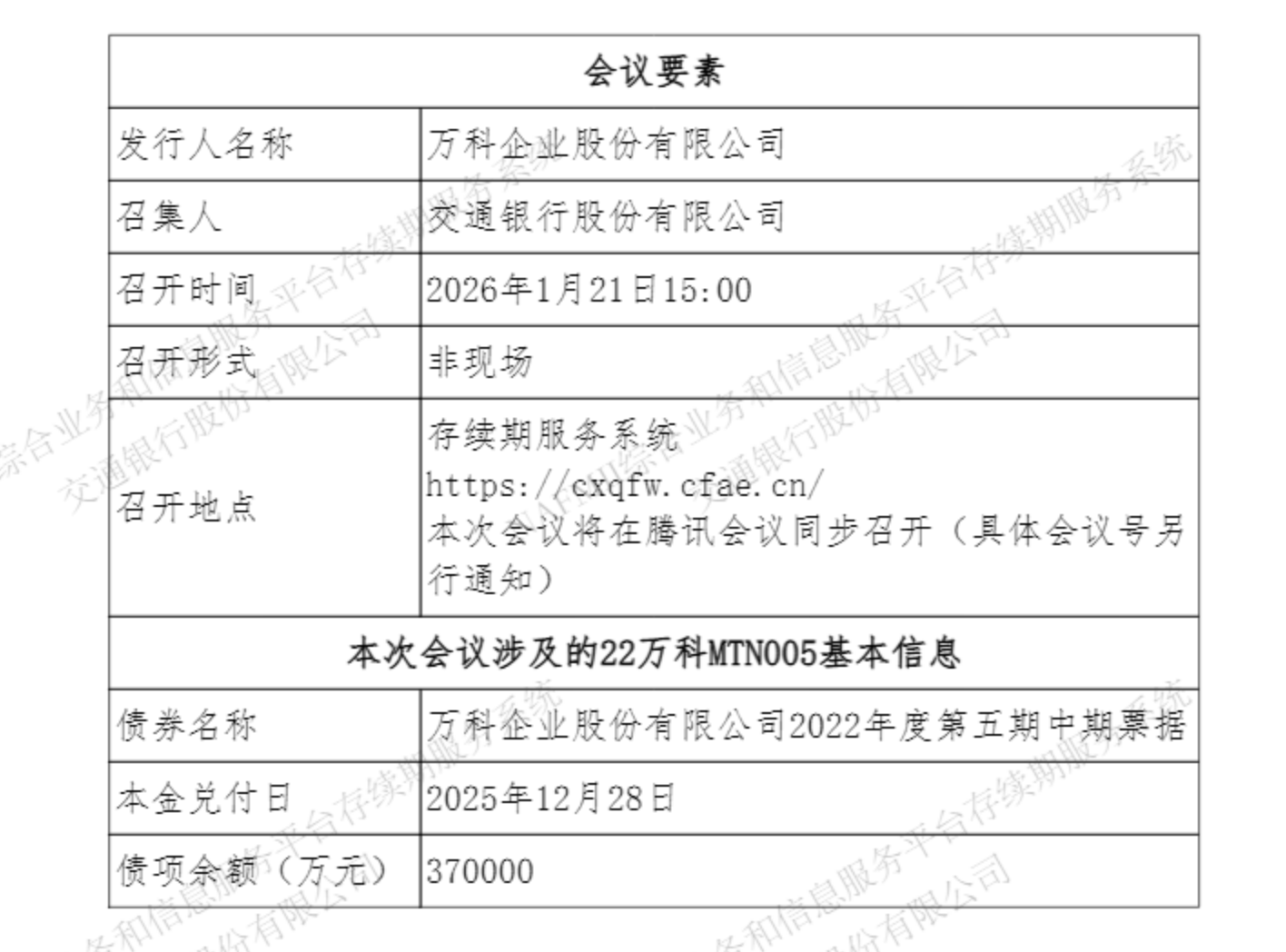 值得关注的是,交通银行同步发布公告称,将在1月21日召开“22万科MTN005”2026年第一次债权人大会,议题同样是债券展期相关事项。