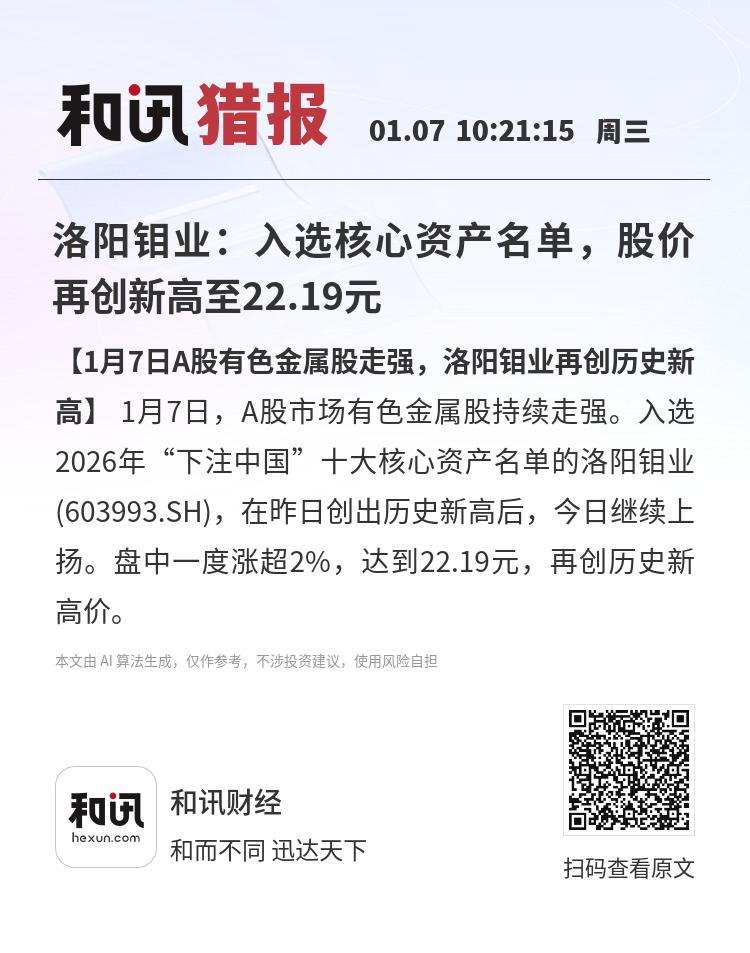 【1月7日A股有色金属股走强,洛阳钼业再创历史新高】 1月7日,A股市场有色金属股持续走强。入选2026年“下注中国”十大核心资产名单的洛阳钼业(603993.SH),在昨日创出历史新高后,今日继续上扬。盘中一度涨超2%,达到22.19元,再创历史新高价。