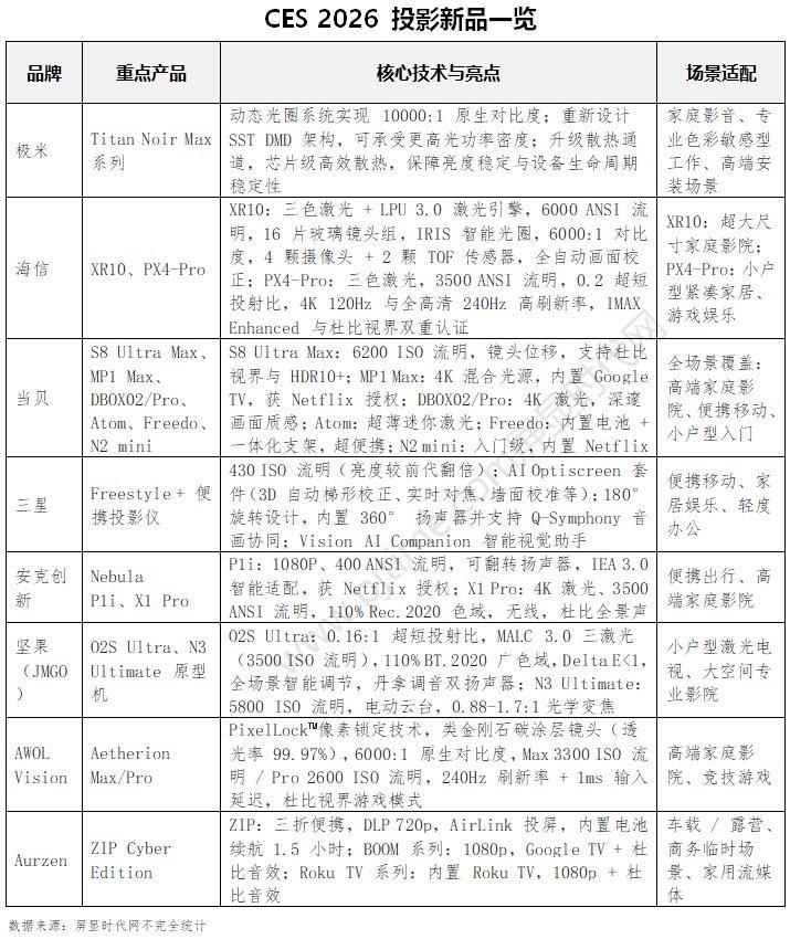 CES 2026 投影机呈现三大核心趋势,技术与场景深度融合。一是激光技术全面普及,三色激光成高端机型标配,搭配动态光圈、散斑抑制技术,实现高色域(110% BT.2020/Rec.2020)、高对比度(最高 10000:1)与高亮度(峰值 6000 ANSI 流明),超短焦(0.16:1)设计适配小户型,长焦机型满足超大屏需求。二是AI 赋能简化操作,AI Optiscreen、多摄像头+ TOF 传感器等技术落地,实现自动梯形校正、实时对焦、墙面校准等功能,降低使用门槛,同时 AI 语音助手提升交互体验。三是场景极致细分,便携机型主打轻量化与长续航,游戏机型强化 240Hz 高刷+ 1ms 低延迟,车载、露营等新兴场景催生定制化设计;影音生态上,4K +杜比视界/全景声成标配,集成 Google TV、Netflix 等平台,打造一站式视听体验。