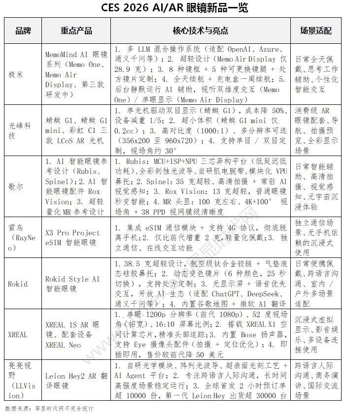 CES 2026 智能眼镜呈现四大核心趋势:一是轻量化与日常化,极米、Rokid 等品牌推出 28.9 克、38.5 克级产品,搭配时尚镜框与处方镜片定制,突破传统设备笨重局限,适配全天佩戴场景。二是AI 深度融合与生态开放,多品牌采用多 LLM 混合系统,支持 ChatGPT、通义千问等主流模型,以语音交互、静默辅助为主,实现翻译、纪要等场景化智能服务。三是技术突破降低普及门槛,光峰科技通过光机创新推动消费级产品价格下探至 1500 元内,XREAL 等品牌升级显示配置同时下调售价,提升性价比。四是功能多元化与独立化,雷鸟 eSIM 眼镜实现脱离手机通信,亮亮视野聚焦专业翻译场景,歌尔推出模块化配件,拓展智能眼镜应用边界。整体向“日常伴侣”定位演进,加速从小众尝鲜走向大众消费。