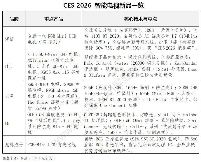 CES 2026 智能电视领域呈现技术深耕与体验升级并行的核心趋势。其一,Mini-LED 与 OLED 双技术路线竞速,RGB-Mini LED 迭代升级(如海信玲珑 4 芯架构),SQD-Mini LED 加速普及(TCL 推动技术普惠),OLED 则聚焦亮度提升与防眩光优化,2026 年 RGB-Mini LED 出货量预计飙升至 50 万台。其二,画质追求极致化,全域高色域(多品牌突破 BT.2020 标准)、高精度控光与护眼节能成为标配。其三,形态设计家居化,超薄机身、无边框及无线连接(Zero Connect)技术普及,画壁、壁纸等个性化产品强化空间融合感。其四,场景适配多元化,高刷(144Hz+)、游戏适配(G-Sync/VRR)与艺术观赏功能覆盖全需求,智能体验升级,AI 处理器与双 AI 助手提升交互效率。
