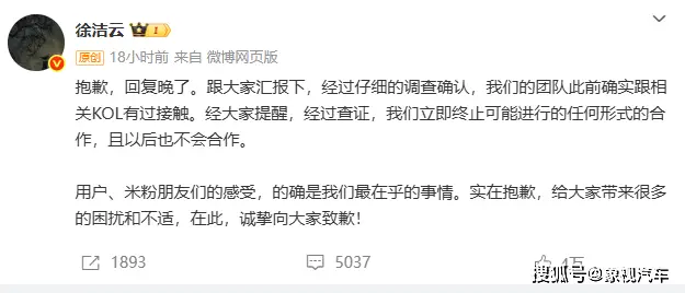 1月5日,小米集团新任公关部总经理徐洁云,在微博上发布了一个道歉申明。