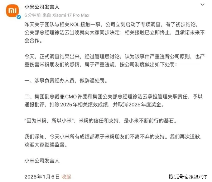 1月6日,小米官方发布消息,辞退涉事负责经办人员,并对徐洁云等高管作出通报批评。种种迹象显示出,这个事情很严重。