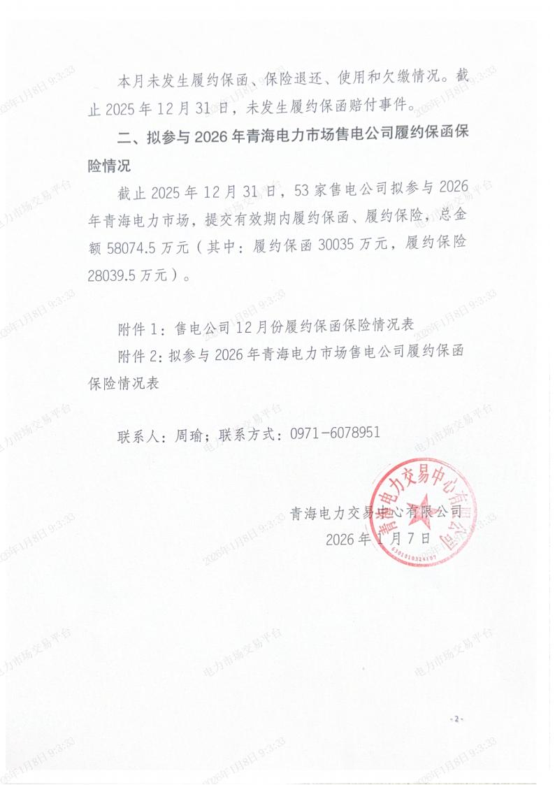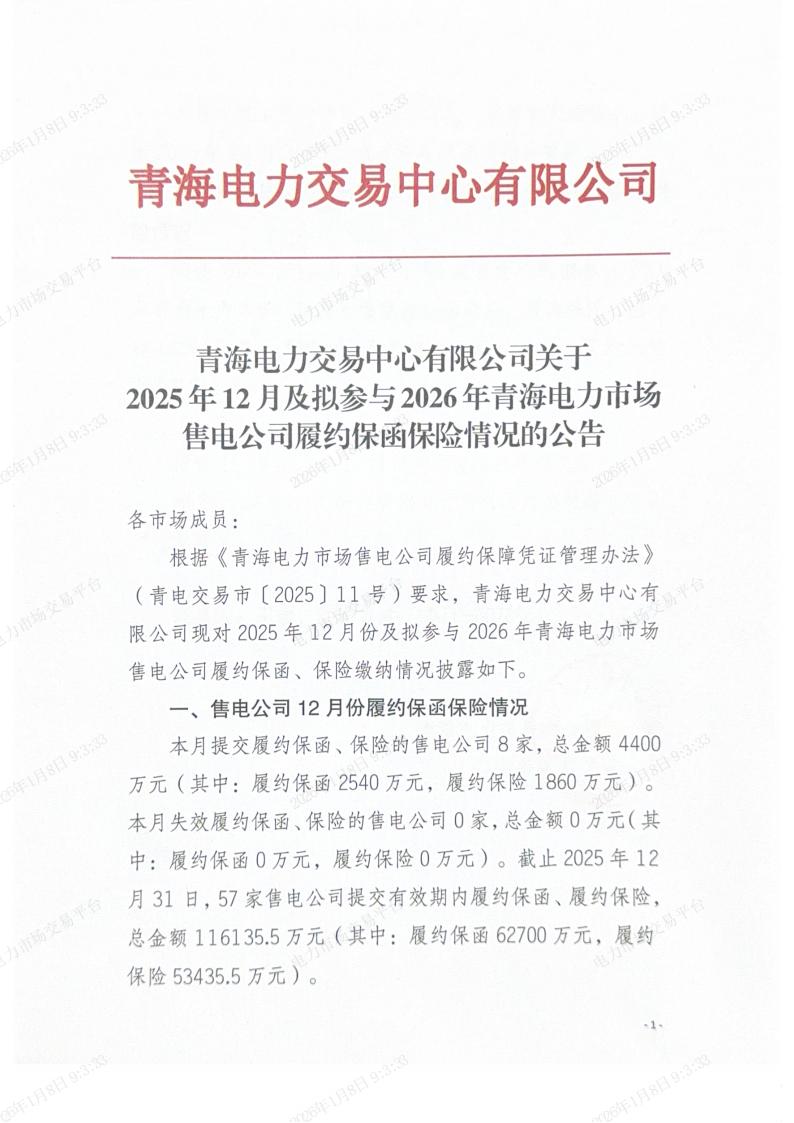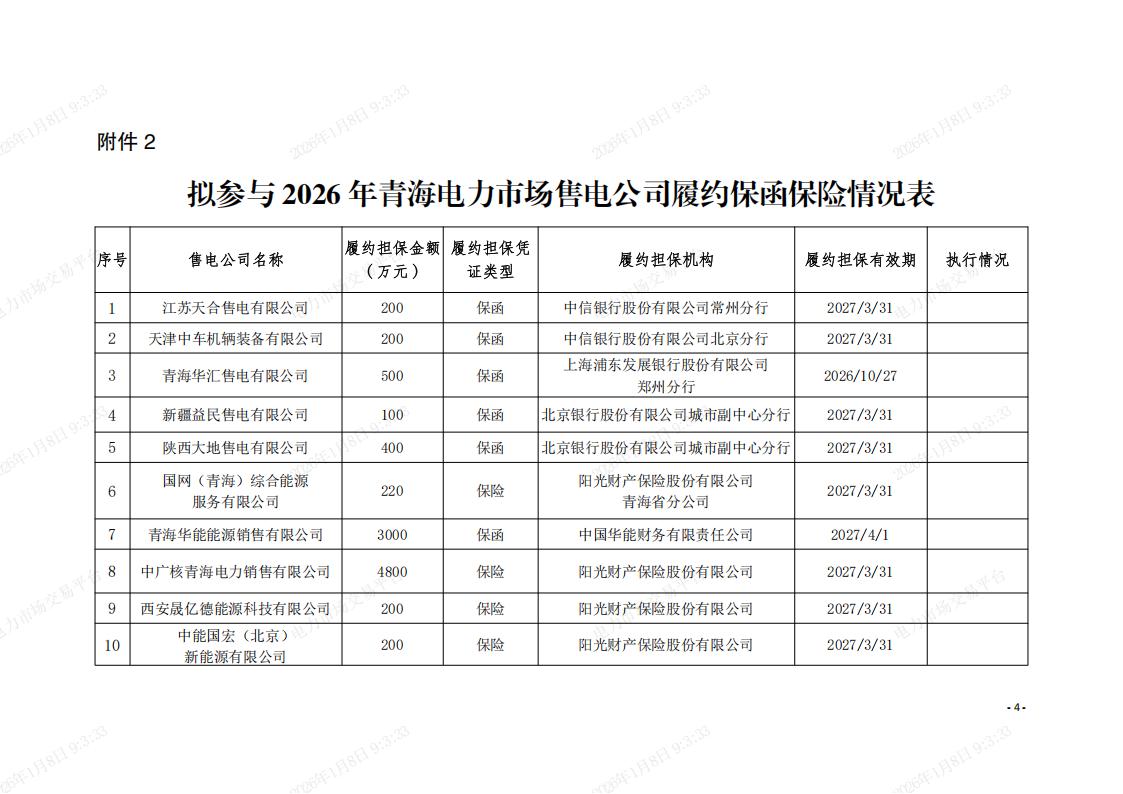 青海2025年12月及拟参与2026年电力市场售电公司履约保函保险情况