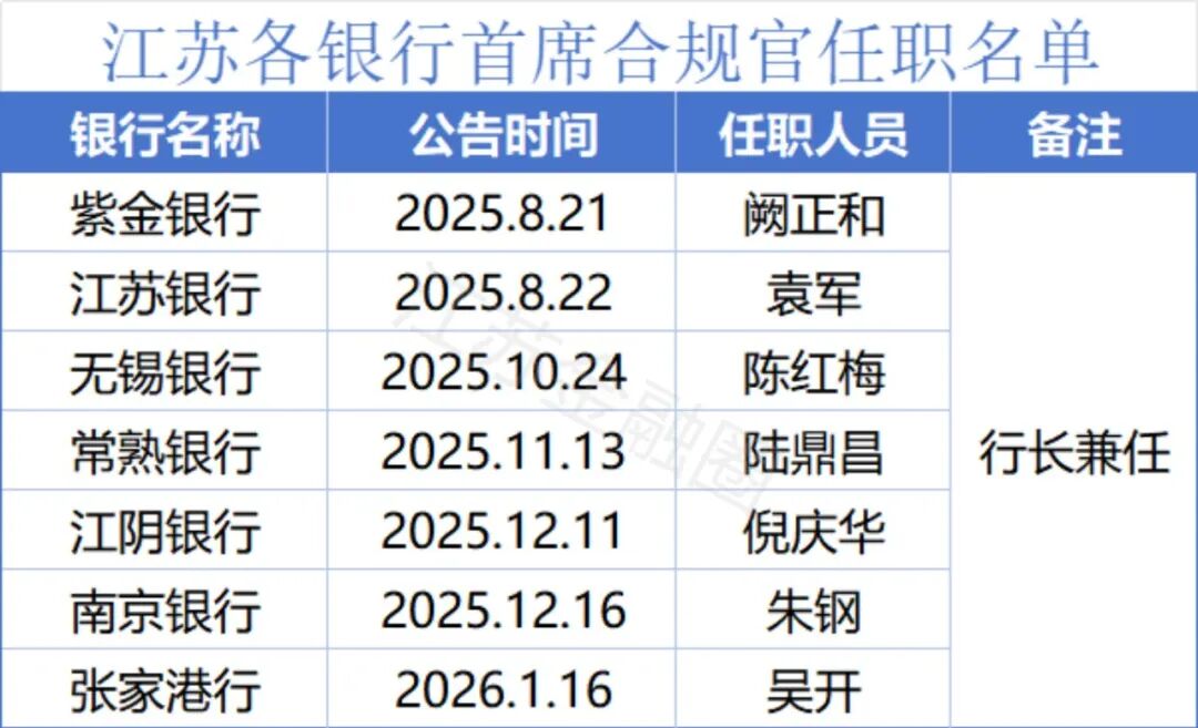 从去年8月紫金银行率先公告,到年底南京银行、江阴银行扎堆跟进,再到2026年初张家港行,一场覆盖全省主流上市银行的合规人事调整,在短短五个月内完成了密集落地。