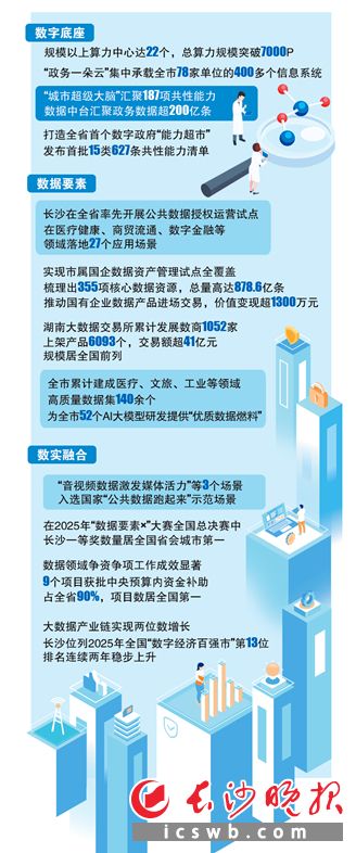 过去一年,长沙交出了一份沉甸甸的数字答卷:成功获批国家区域数据基础设施先行先试试点;智慧城市实践案例入选联合国人居署世界城市日《上海手册》2025年度报告;“音视频数据激发媒体活力”等3个场景入选国家“公共数据跑起来”示范场景;在2025年“数据要素×”大赛全国总决赛中,长沙一等奖数量居全国省会城市第一;数据领域争资争项工作成效显著,9个项目获批中央预算内资金补助,占全省90%,项目数居全国第一;大数据产业链实现两位数增长,长沙位列2025年全国“数字经济百强市”第13位,排名连续两年稳步上升……这些亮眼的成绩,标志着长沙稳步跻身全国数字化发展“第一方阵”。