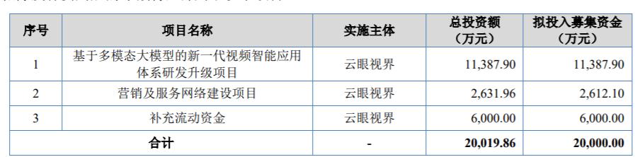 本次IPO,云眼视界拟投入募集资金2亿元,分别用于基于多模态大模型的新一代视频智能应用体系研发升级项目、营销及服务网络建设项目及补充流动资金。