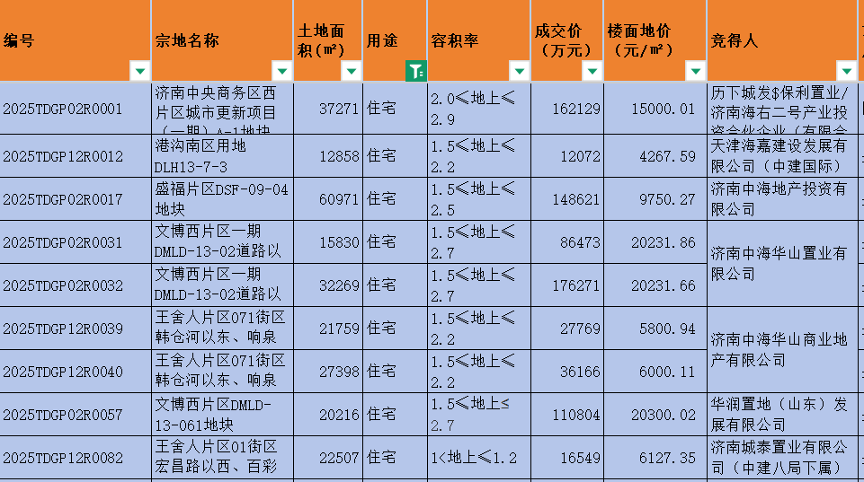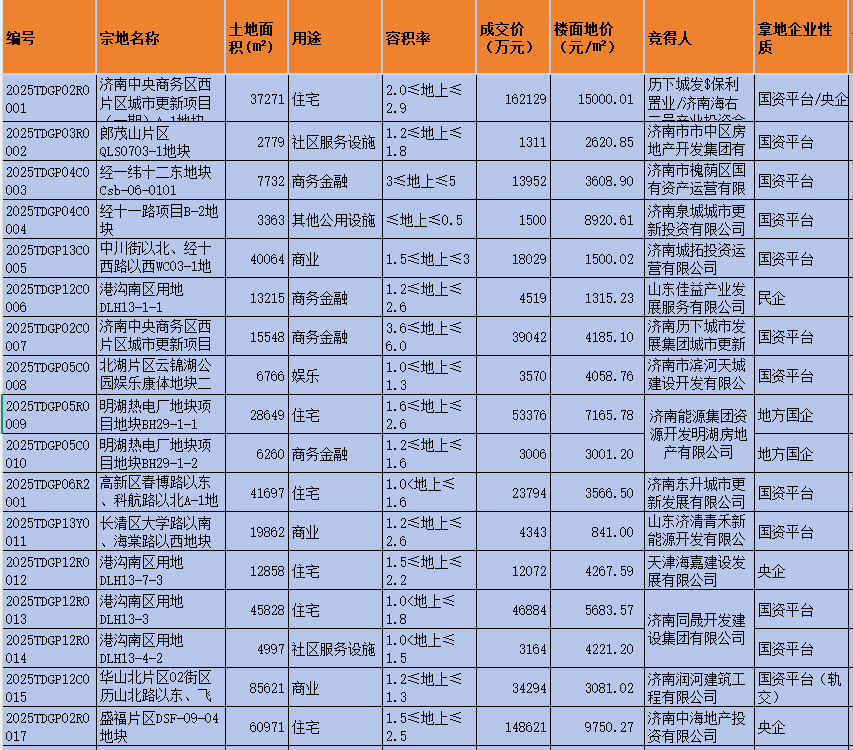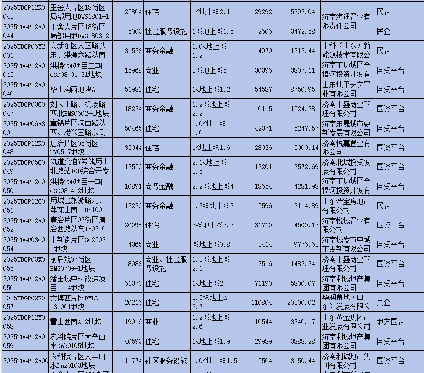 2025年,济南成功出让的城市建设用地,包含居住用地、商业商务用地、社区服务用地等,一共是87宗,面积合计是2393亩。
