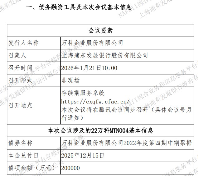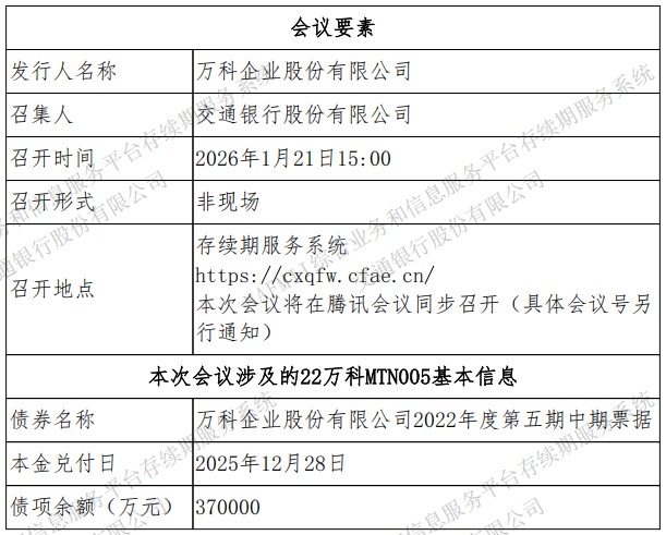 久期财经讯,1月7日,主承销商浦发银行和交通银行发布关于“22万科MTN004”和“22万科MTN005”2026年第一次持有人会议的公告。