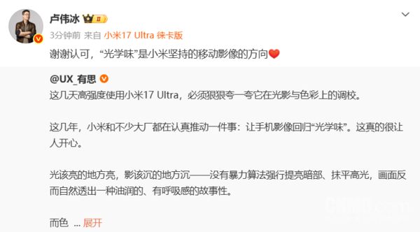 1月8日,小米集团总裁卢伟冰发文回应了一位博主对小米移动影像方向的认可,并明确表示“光学味”是小米始终坚持的移动影像的方向。