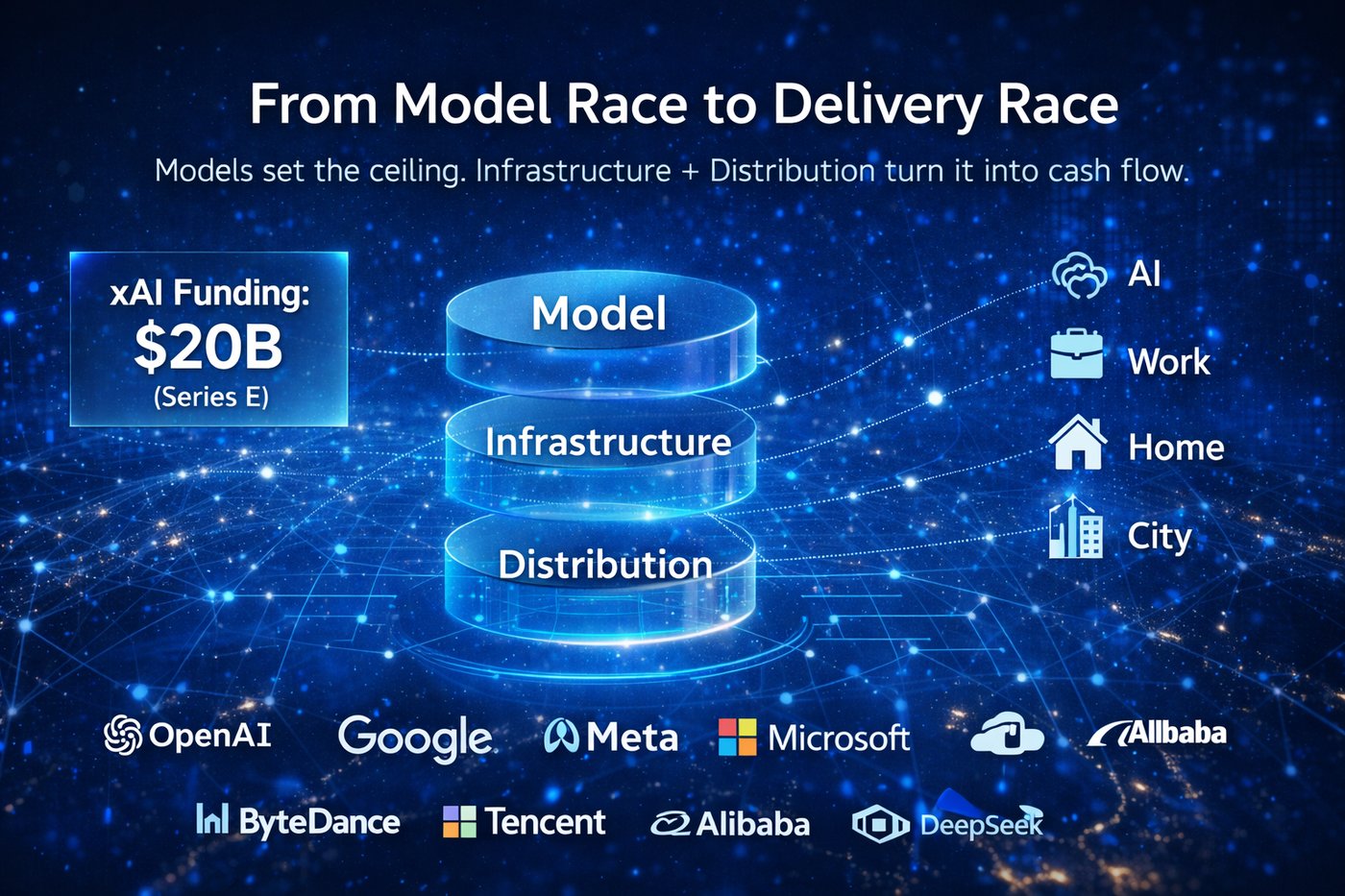 xAI 的 200 亿美元并不只是一个新对手的故事,更像一条分界线。模型仍决定上限,但行业的胜负越来越取决于交付侧的系统能力。底座决定供给确定性与单位成本,入口决定持续调用与现金流闭环,交付能力决定能否把体验稳定送达用户与企业。大模型竞争正在从以模型为中心转向以交付为中心,这不是口号,而是成本曲线、扩散速度与商业化闭环共同推出来的结构变化。