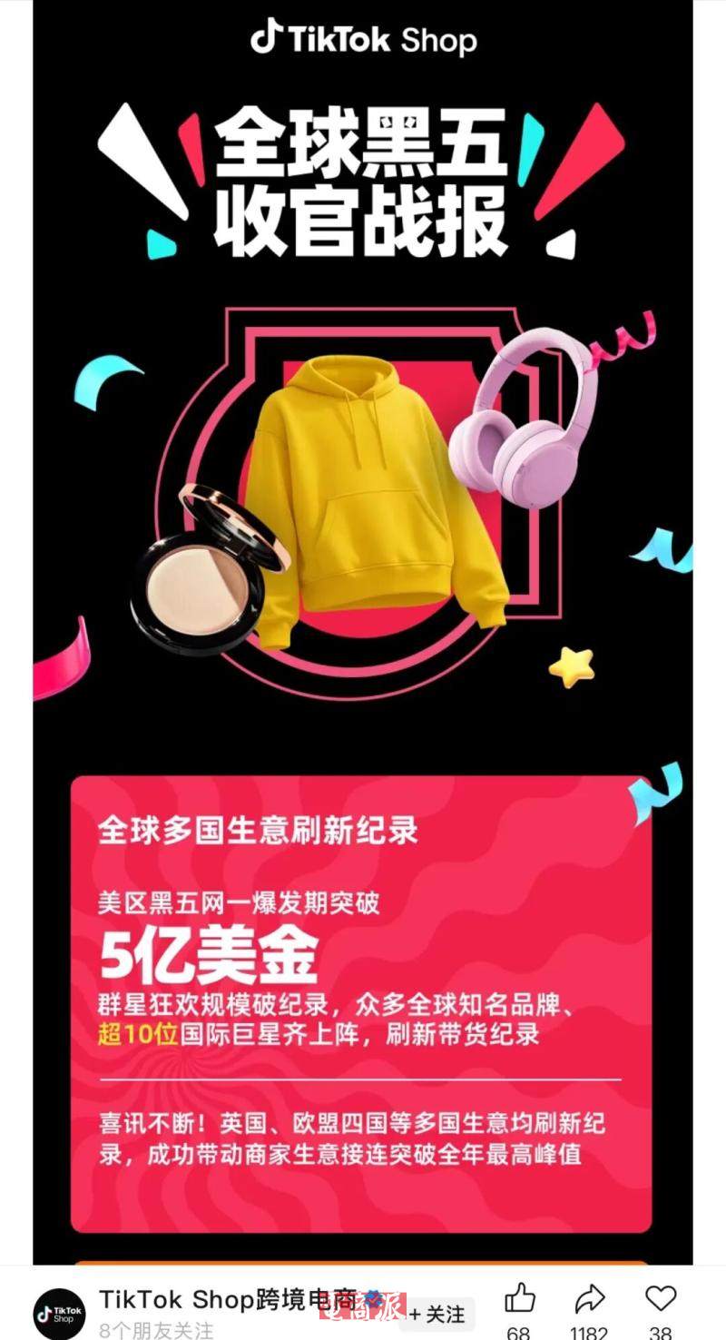 据TikTok Shop发布的消息,2025年11月28日到12月1日的“黑五网一”4天内,平台美区GMV突破5亿美元,在美国通过TikTok Shop购买商品的消费者增加近50%。