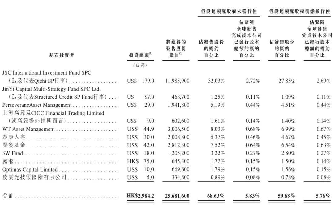 其中,JSC International Investment Fund SPC认购1.79亿美元,JinYi Capital Multi-Strategy Fund SPC Ltd认购700万美元,PerseverancAsset Management认购2900万美元,上海高毅认购900万美元,WT Asset Management认购4490万美元,泰康人寿认购3000万美元,广发基金认购4200万美元,3W Fund认购1800万美元,雾凇认购7500万美元,Optimas Capital Limited认购1000万美元,凌云光技术国际有限公司认购500万美元。