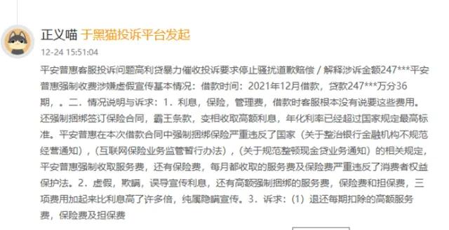 黑猫平台上,一位用户痛述:利息,保险,管理费,借款时平安普惠客服根本没有说要这些费用。还强制捆绑签订保险合同,霸王条款,变相收取高额利息,年化利率已经超过国家规定最高标准。