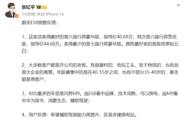 在竞争层面,该店的销售反映客户对比最多的车型是问界M9。消费者的选择逻辑明确:选择ES8的用户看重其高端品牌形象、技术成熟度以及独特的换电体系;而倾向问界M9的用户则更看重华为的科技背书、鸿蒙智能生态以及领先的辅助驾驶系统。