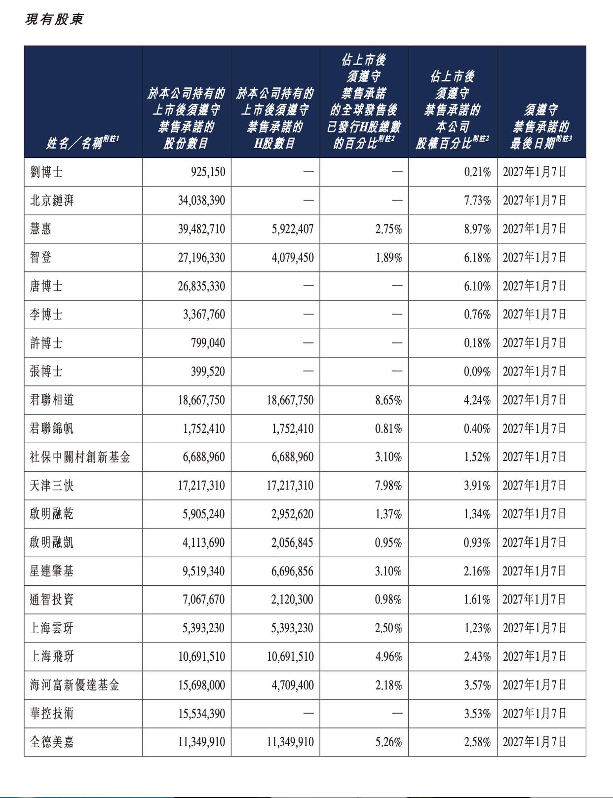 招股书显示,智谱无控股股东。IPO后(假设超额配股权未获行使),刘德兵博士及其控制的北京链湃、慧惠、智登,连同唐杰博士、李涓子博士、许斌博士、张鹏博士,为一致行动人,合计持股约30.22%。其中,刘德兵直接持股0.21%,他作为GP控股92.70%的北京链湃持股7.73%,他作为GP的慧惠、智登分别持股8.97%、6.18%;唐杰持股6.10%;李涓子持股0.76%;许斌持股0.18%;张鹏持股0.09%。