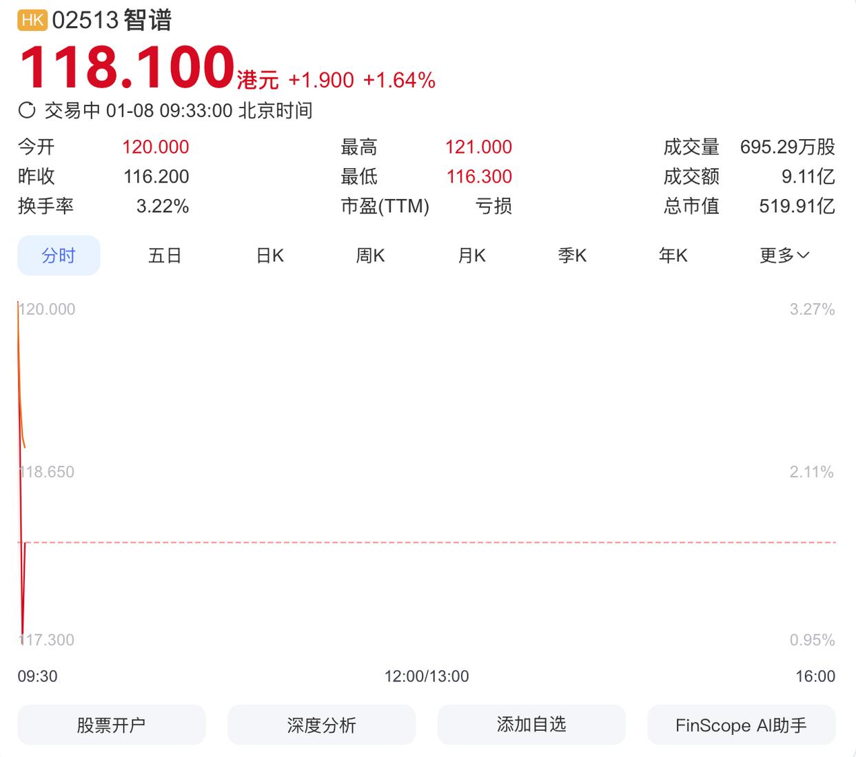 今日开盘,智谱微涨3.27%报120港元,总市值约528.27亿港元。