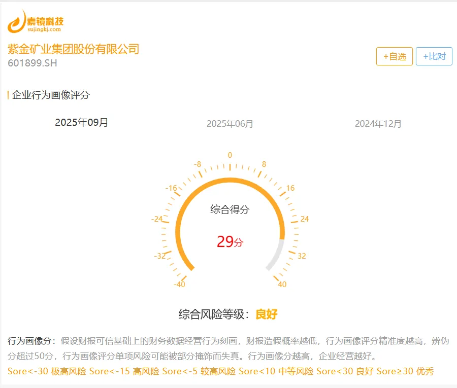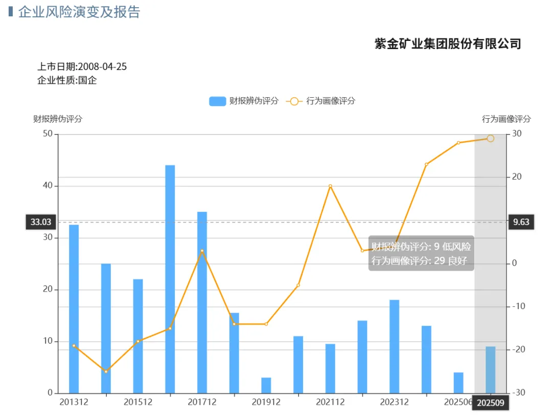 历史发文 现在看来,紫金矿业逆周期并购似乎是绝佳的明智之举,而在当时企业面临全球并购的地缘政治风险,屡屡踩雷,标普将紫金矿业评级连续下调,直至2025年10月才调回;而惠普却在自2020年一路下调评级后,2024年7月,突然撤销评级。而在本号首次发文,力挺紫金矿业时,其股价跌至2元上下,令人唏嘘。历史发文链接: 2020-07-27 紫金矿业连遭降级,不安世界,危中求机 2021-03-24 紫金矿业,一季度业绩大增,为啥却挡不住股价的颓势? 2023-01-05 紫金矿业踩雷解读—已预判,未来趋势展望 从紫金矿业最新2025年三季报表现看,企业依然保持历史造假信号无预警,经营状况处于明显上升阶段,目前“良好”。唯一最大的风险仍是“或有风险”,具体到紫金矿业也即地缘政治的不确定损失。 历年财报造假信号及经营画像