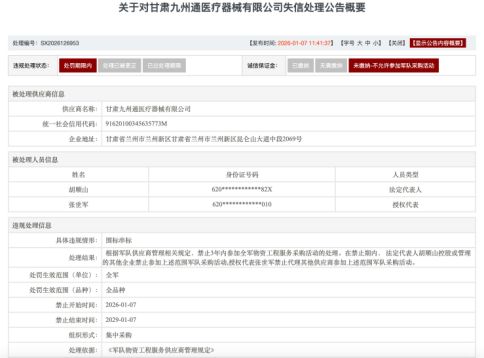 1月7日,军队采购网发布公告,甘肃九州通医疗器械有限公司在军队采购活动中存在围标串标等违规行为,根据军队供应商管理相关规定,3年禁止全军物资工程服务采购活动的处罚。