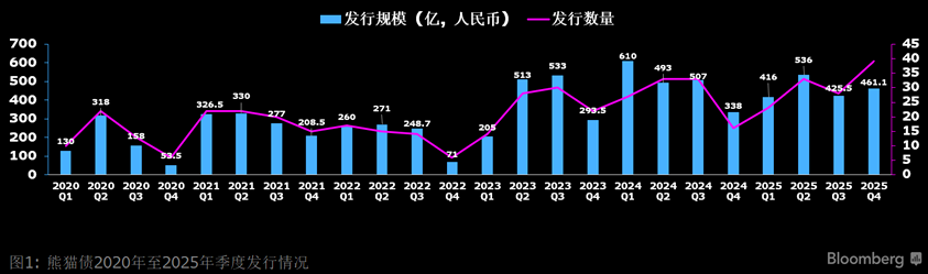 2025年度,截至12月31日,境外机构在境内发行的熊猫债规模达到1839亿元,发行规模趋于稳定,与去年同期相比减少5.62%。整体来看,2025年度中国境内信用债发行量约为19.08万亿元,发行规模与2024年同期相比,增长约6.85%。