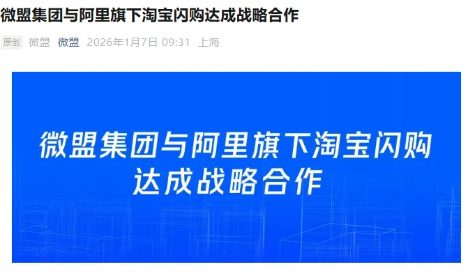 1月6日,微盟集团在香港交易所发布自愿公告称,集团旗下上海微盟企业发展有限公司已与阿里巴巴集团旗下本地生活服务平台“淘宝闪购”的平台主体上海拉扎斯信息科技有限公司(公告简称“拉扎斯”)签署战略合作协议。公告披露,双方将围绕即时零售、数字营销、技术创新等方向展开多维合作:一是“解决方案商家互联”,共建即时零售生态;二是“公私联营、会员打通”,推进一站式营销升级;三是在企业级客户拓展、人工智能与数据运营等场景探索共建。微盟同时表示,将依托成熟的销售渠道与客户基础,结合淘宝闪购在技术、运营、营销上的支持,打造本地零售“到家、到店”一体化解决方案,并推动集团客户进入淘宝闪购平台经营、引入优质新行业客户以带动订阅解决方案营收增长。微盟也将进入淘宝闪购营销业务,拓展商家解决方案空间。