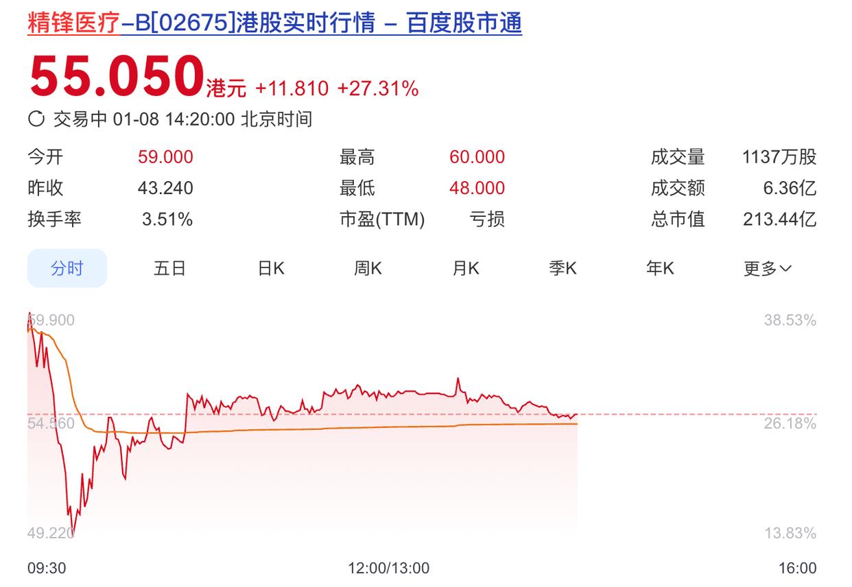 截至发稿,精锋医疗每股涨27.31%至55.05港元,总市值213.44亿。