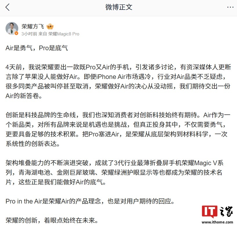 据方飞介绍,iPhone Air 市场遇冷,行业对 Air 品类不乏疑虑,很多同类产品被叫停甚至取消,荣耀做好 Air 的决心从没动摇,我们期待交出一份 Air 的新答卷。把 Pro 塞进 Air,是荣耀从底层架构到材料科学,一次系统性的创新表达。Pro in the Air 是荣耀 Air 的产品理念,也是对用户期待的回应。