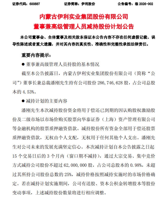 1月8日,伊利股份公告称,公司董事长兼总裁潘刚计划通过大宗交易或集中竞价方式减持不超过6200万股,占公司总股本的0.98%,减持股份来源于股权激励及集中竞价取得。