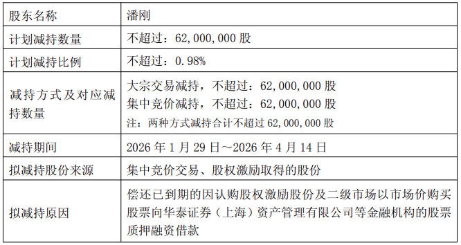 根据公告信息,董事长兼总裁潘刚计划自本公告披露之日起15个交易日后的3个月内(窗口期不减持),通过大宗交易、集中竞价方式减持公司股份不超过6200万股,占公司总股本的0.98%,未超过其所持公司股份总数的25%,减持价格按照减持实施时的市场价格确定。