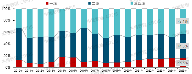 图:2010-2025年300城各线城市住宅用地成交出让金占比