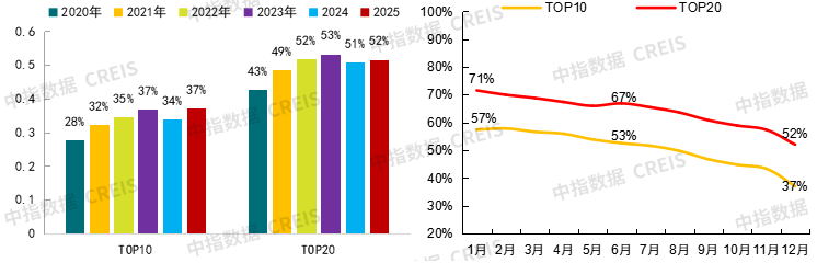 图:TOP10、TOP20宅地历年年度和2025年以来月度出让金占全国的比重