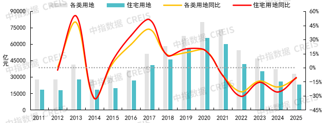 注:数据统计口径为公开招拍挂市场成交地块。自2025年起,中指数据扩大了300城土地覆盖范围,目前已涵盖全部地级及以上城市,历史数据为可比口径