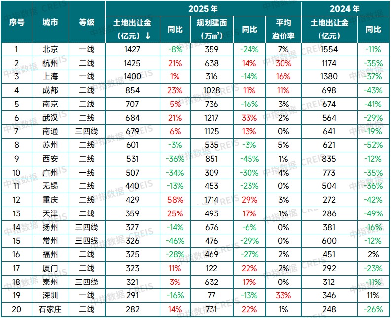 表:2024-2025年全国住宅用地出让金TOP20(全市)