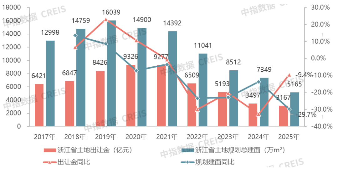 图:2017年-2025年浙江省经营性用地出让金&规划总建面