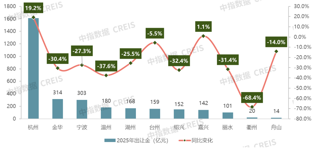 1、2025年浙江省经营性用地出让金规模持续下行,仅杭州和嘉兴同比增加;