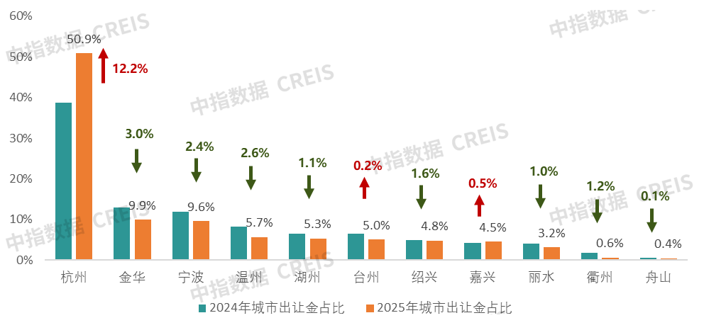 整体拿地金额下降9%,仅杭州和嘉兴出让金同比提升