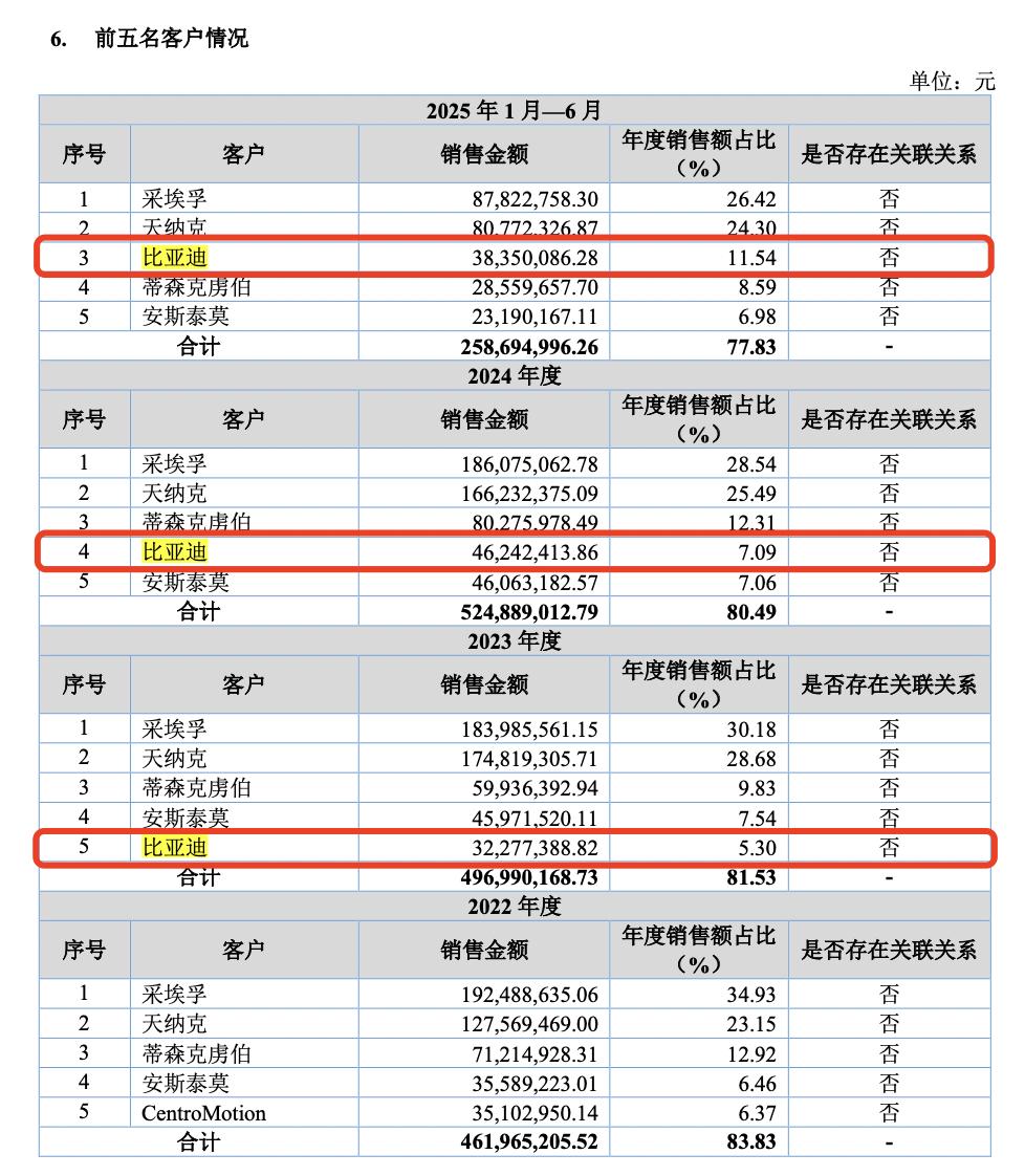 2023年-2024年及2025上半年,比亚迪均进入公司前五大客户,贡献销售占比分别为5.3%、7.09%、11.54%。