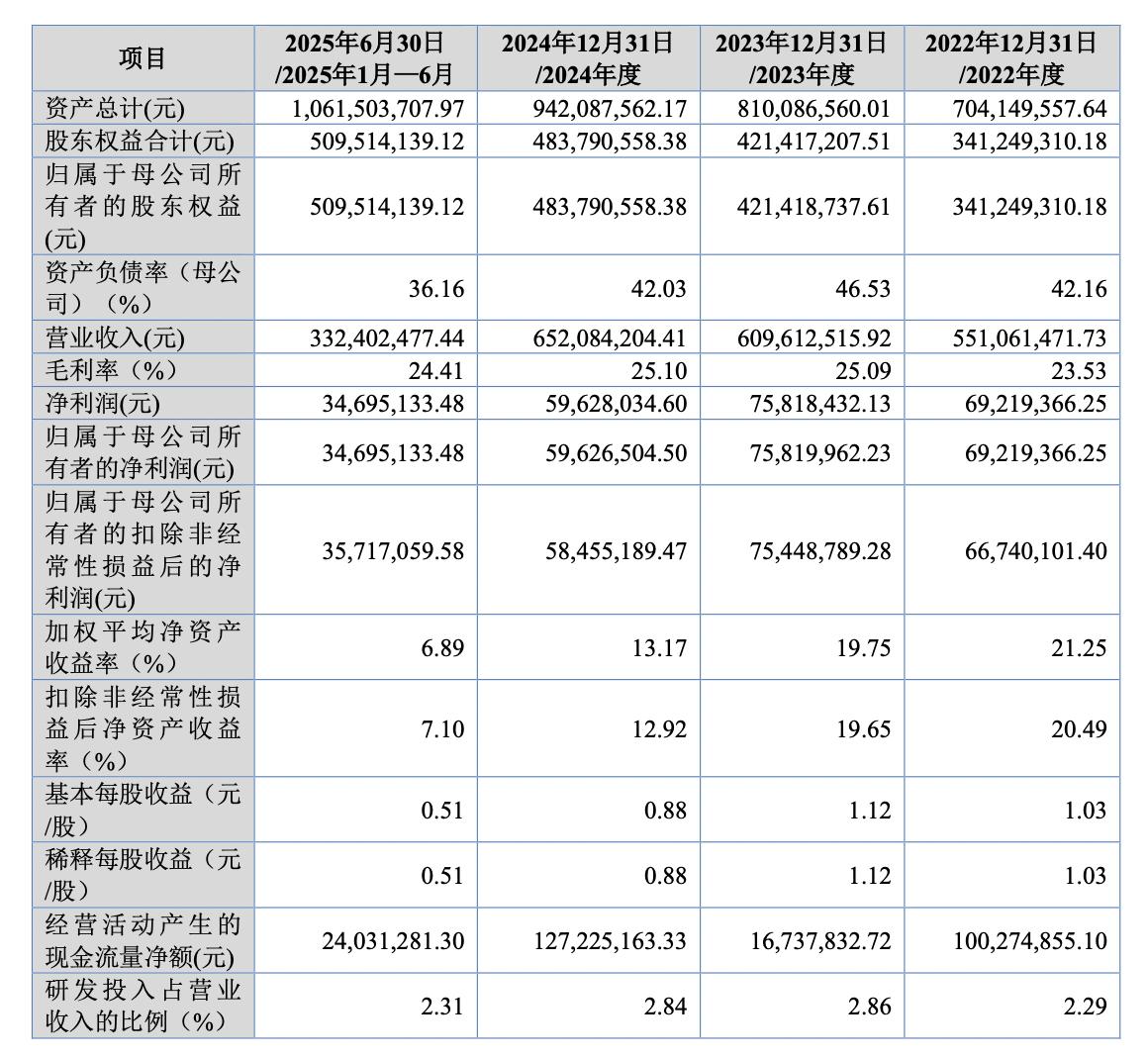 据招股书,2022年-2024年及2025上半年,培源股份实现营收分别为5.51亿元、6.1亿元、6.52亿元、3.32亿元;归母净利润分别为6921.94万元、7582万元、5962.65万元、3469.51万元。