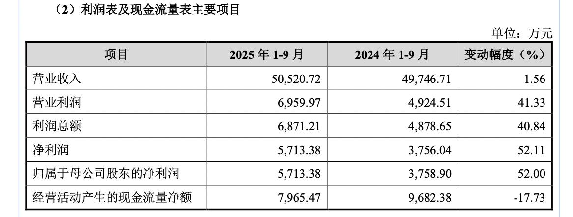 2025年1-9月,公司实现收入为5.05亿元,同比增长1.56%;归母净利润为5713.38万元,同比增长52%。