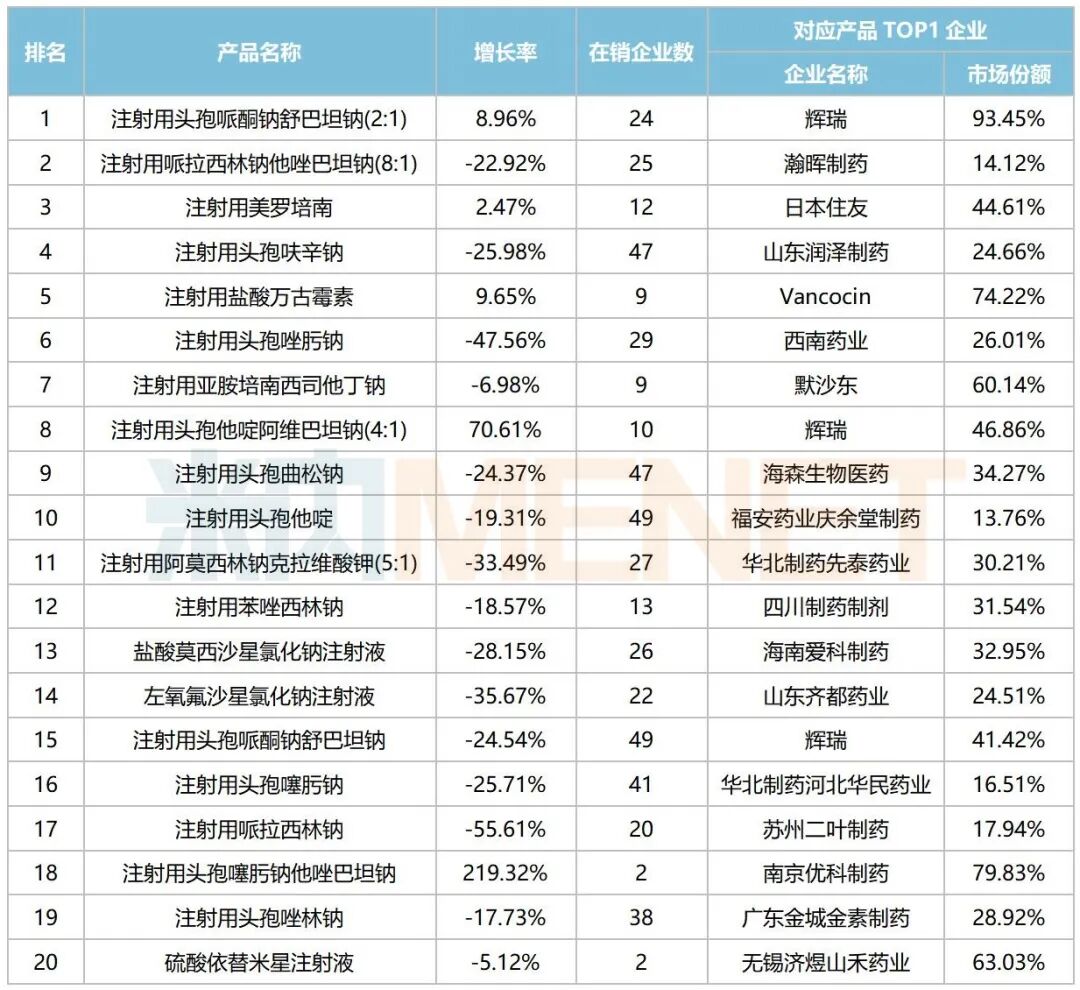 从增长情况看,5个产品逆势增长,其中有2家企业在销的注射用头孢噻肟钠他唑巴坦钠飙涨219.32%,首次跻身TOP20产品;有10家企业在销的注射用头孢他啶阿维巴坦钠(4:1)大涨70.61%,较2024年提升11个位次;注射用盐酸万古霉素涨幅接近10%,较2024年提升7个位次等。